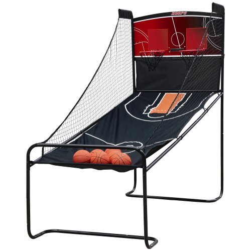 It may look and play like an arcade basketball shoot-em-up, but the Harvard M01462W Double Shootout basketball game is designed for home use. The game features two arcade-style basketball goals, each with infrared eyes for increased scoring accuracy. As a result, the game provides edge-of-your-seat action as the two-player electronic scoring system counts down to the buzzer. The M01462W is also well built, with a 1-1/4-inch steel tubing frame that adds sturdiness and stability. Best of all, the game easily folds away to save space in your home. The game, which includes four mini basketballs and an air pump, measures 45 by 89 by 106 inches during gameplay.